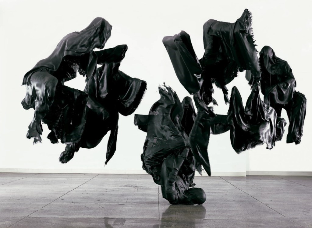 Another Morris work from Boustrophedons, Out of the Past, (figure 6) represents human fantasies, cruelties, and perversions. Created in the same style as The Big Sleep, Morris’s work depicts hovering black draperies that were inspired by Goya’s drawings of Witches and Old Women. The first sheet of Goya’s album shows an aged witch hovering in space, yanking the hair of a younger maidservant while two other witches float behind them.[17] Out of the Past takes inspiration from Goya, bringing forth “the Vanities, follies, cruelties, superstitions, fantasies, disgusts, and perversions of old age.”[18] Out of the Pasts’s nightmare-like appearance conjures up unsettling images of the unconscious, adding a surreal quality to the sculpture. Created in the same style as The Big Sleep, the high contrast fabric helps display the movement of each figure. While one form balances on the floor by its head and neck, the other five figures dance around it in mid-air, held up by transparent string. Unlike The Big Sleep, the forms aren’t fully covered, as one can see the missing void of a figure underneath the fabric, creating the illusion of an invisible form. The dynamic and unique poses of each form create a flowing movement throughout the dancing figures. Out of the Past is an ideal work to be viewed in The Human Condition because it represents the repressed conflicts of the human psyche and the deterioration of the human mind. Like our bodies, the human mind deteriorates with time and old age. As Morris entered old age, death and mental deterioration were becoming more relevant themes in his life, as they are relevant to anyone of old age. Therefore, the exhibition ends the way life does, with the deterioration of old age, and death.